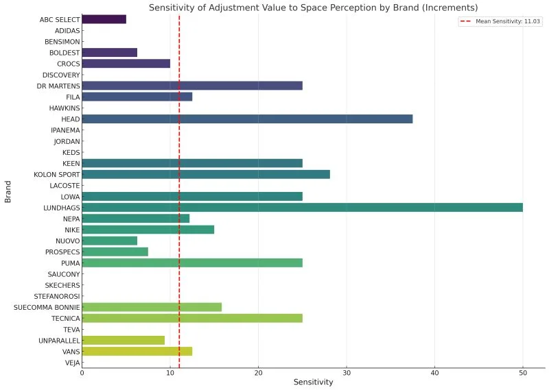 Perfitt took a closer look at these challenges by conducting a groundbreaking study. The team analyzed detailed internal shoe measurements and compared them to actual size choices made by customers. This research introduced the concept of "Size Sensitivity", highlighting how size selection varies across brands.